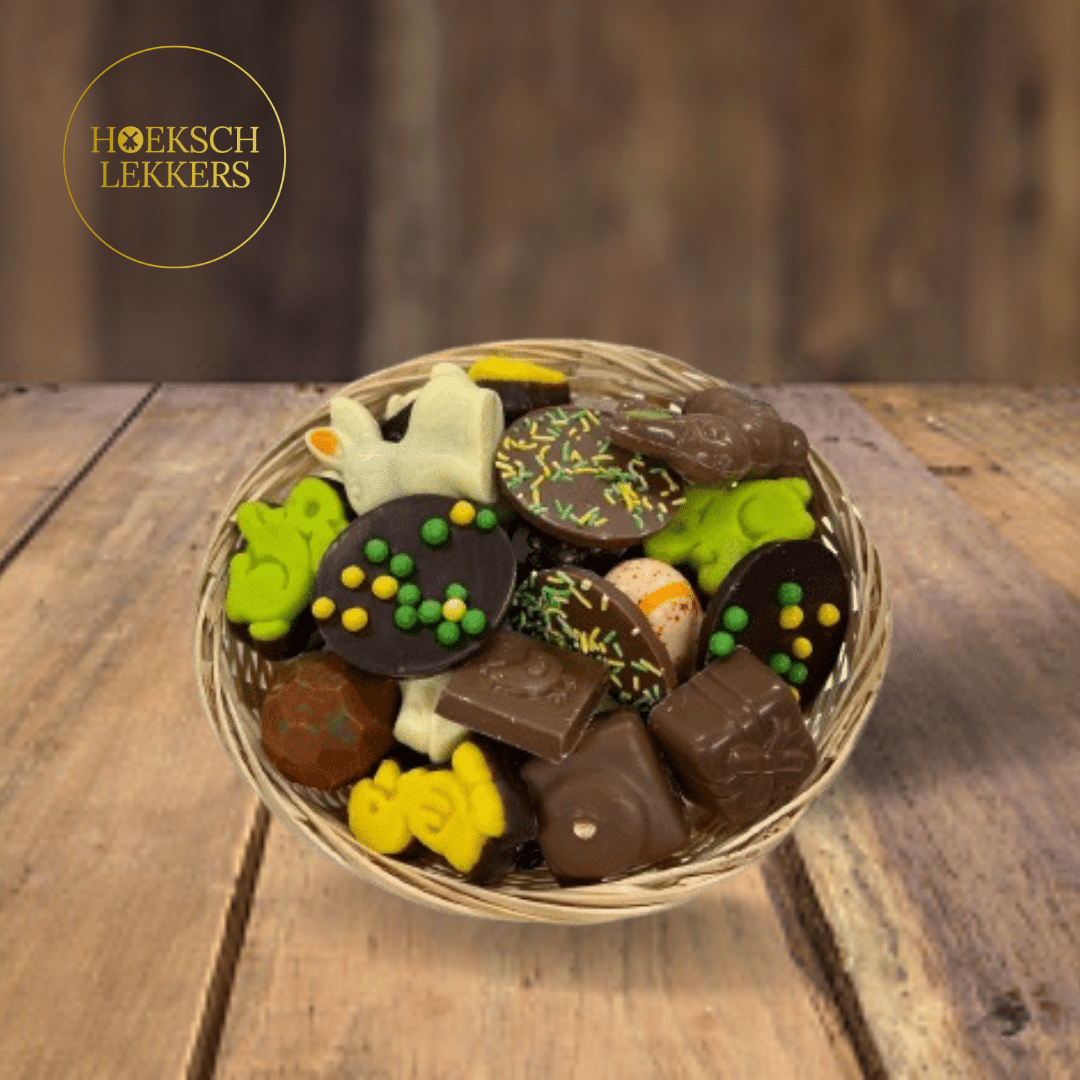 In dit mooie mandje vind je een gevarieerde selectie van paaschocolade voor iedere liefhebber. Van verfijnde bonbons tot knapperige flikken en van zachte marsepein tot vrolijke paasfiguurtjes – alles komt samen in dit luxe mandje.