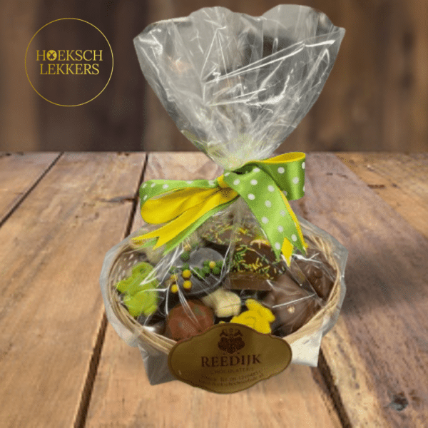 Een feestelijk en royaal gevuld paasgeschenk waarmee je echt uitpakt. Dit cadeaumandje met paaschocolade zit boordevol heerlijke Belgische kwaliteitschocolade en wordt met zorg samengesteld door Chocolaterie Reedijk.